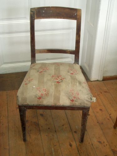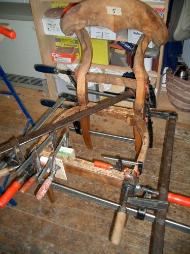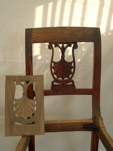 Zerlegen und verleimen der kompletten Stühle; Ergänzung der Schnitzerei im Rückenbereich bei einem Stuhl.