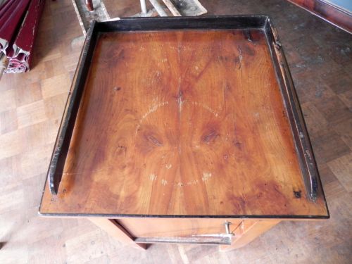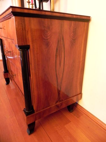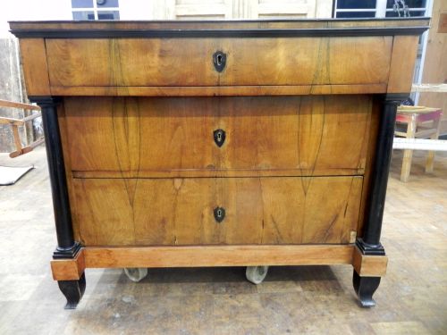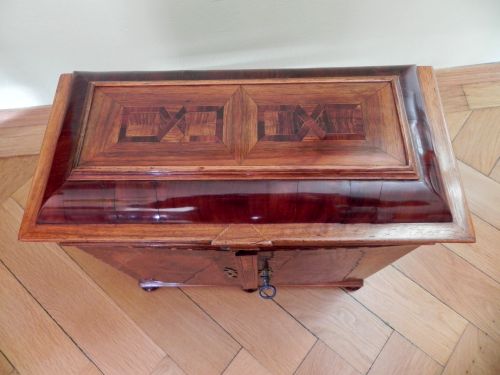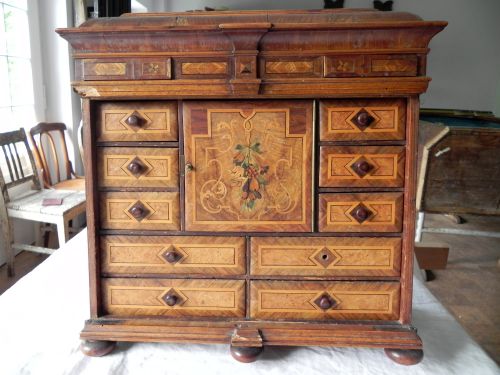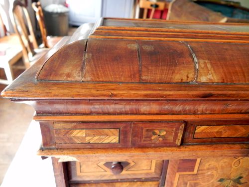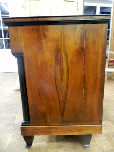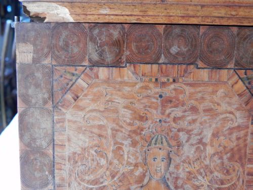 Die Besonderheit ist vor allem das Hirnholzfurnier an den Seiten und den Türen; Ausführung von konstruktiven Arbeiten und Furnierarbeiten; Austausch von Fehlergänzungen; Oberflächenbehandlung Schellack-Handpolitur