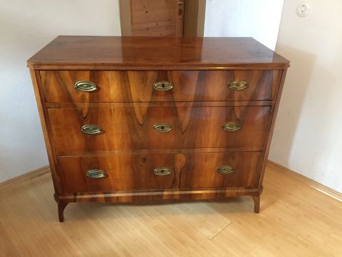 Profilleiste im Sockelbereich wurde bei früherer Restaurierung durch längslaufende Buchenleiste falsch ergänzt; Ergänzung dieser Leisten mit durchlaufendem Nussbaumfurnier; Schwundrisse seitlich wurden verleimt; Aufdoppeln der Laufleisten der Schubkästen